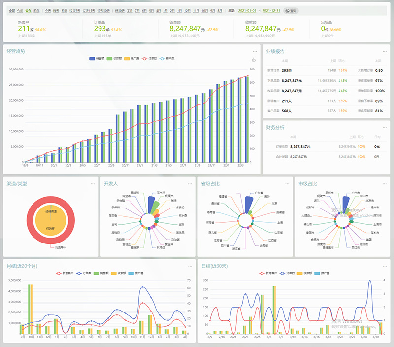 客户来源渠道、开发人、地域、接入场景以及客户类型占比等一目了然,有助于管理者更容易通过通过调整推广策略来优化产出;